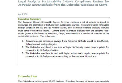 Current plans to produce biofuels from the jatropha feed-stocks grown at the Dakatcha woodland, Kenya, would result in a number of breaches of the sustainability criteria.